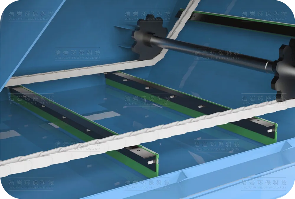 采用K系列重载减速机与弯板链条,结构坚固。出口设自重擦泥器,避免污泥回带;底部柔性橡胶条保护箱体,水下传动部件免维护周期达36个月。