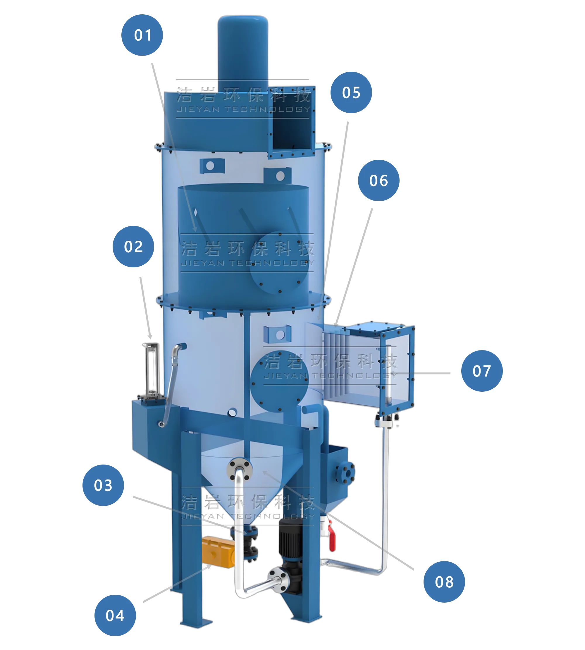 3.气体与洗涤液紧密结合后,有害物质被粘结分离出,通过径向安装的螺旋分离器产生的离心力将水与已化合的有害物体分离开;
