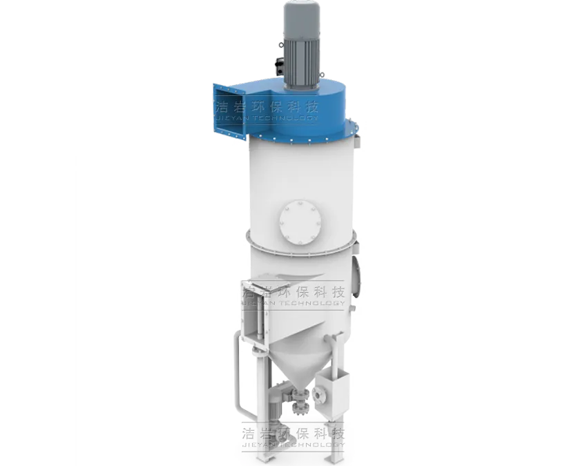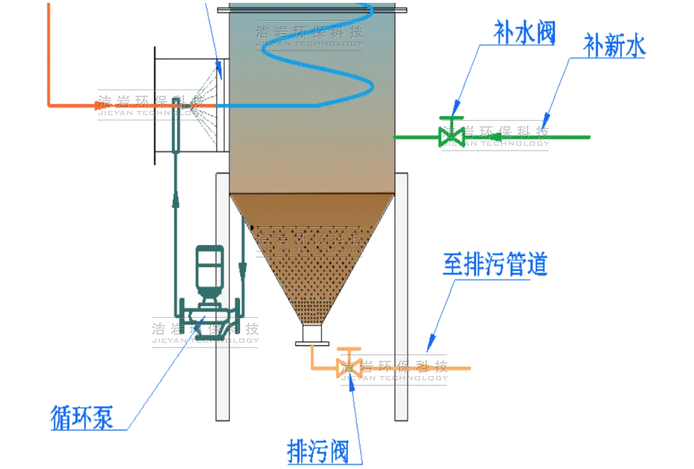 ◈ 离开喉管后,气流进入旋流除尘器腔体,含尘气流由筒体下部导入,气流的特殊路径可以产生强 烈的水漩涡,含有粉尘的气流被导入该水漩涡,这些含尘液滴在旋流除尘器内因重力沉降、离心 分离和挡板拦截等方式被捕集,从而实现粉尘与气体的分离